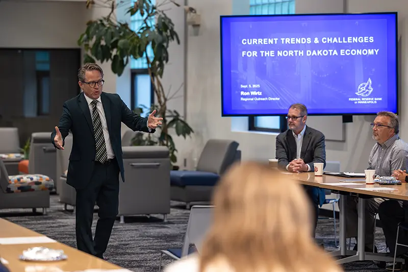 On Friday, September 5th, the EDC hosted Ron Wirtz, Director of Regional Outreach for the Federal Reserve Bank of Minneapolis, for a conversation with regional business leaders. Ron shared valuable insights on the North Dakota economy. His presentation included timely data and survey results from attendees, sparking an engaging discussion about regional economic trends. These outreach sessions play a vital role in informing the Minneapolis Fed about economic conditions across the Upper Midwest. The insights gathered contribute to reports that help shape national monetary policy – including decisions on interest rates. We’re grateful to Ron and the Minneapolis Fed for their continued partnership in supporting our region’s economic growth.